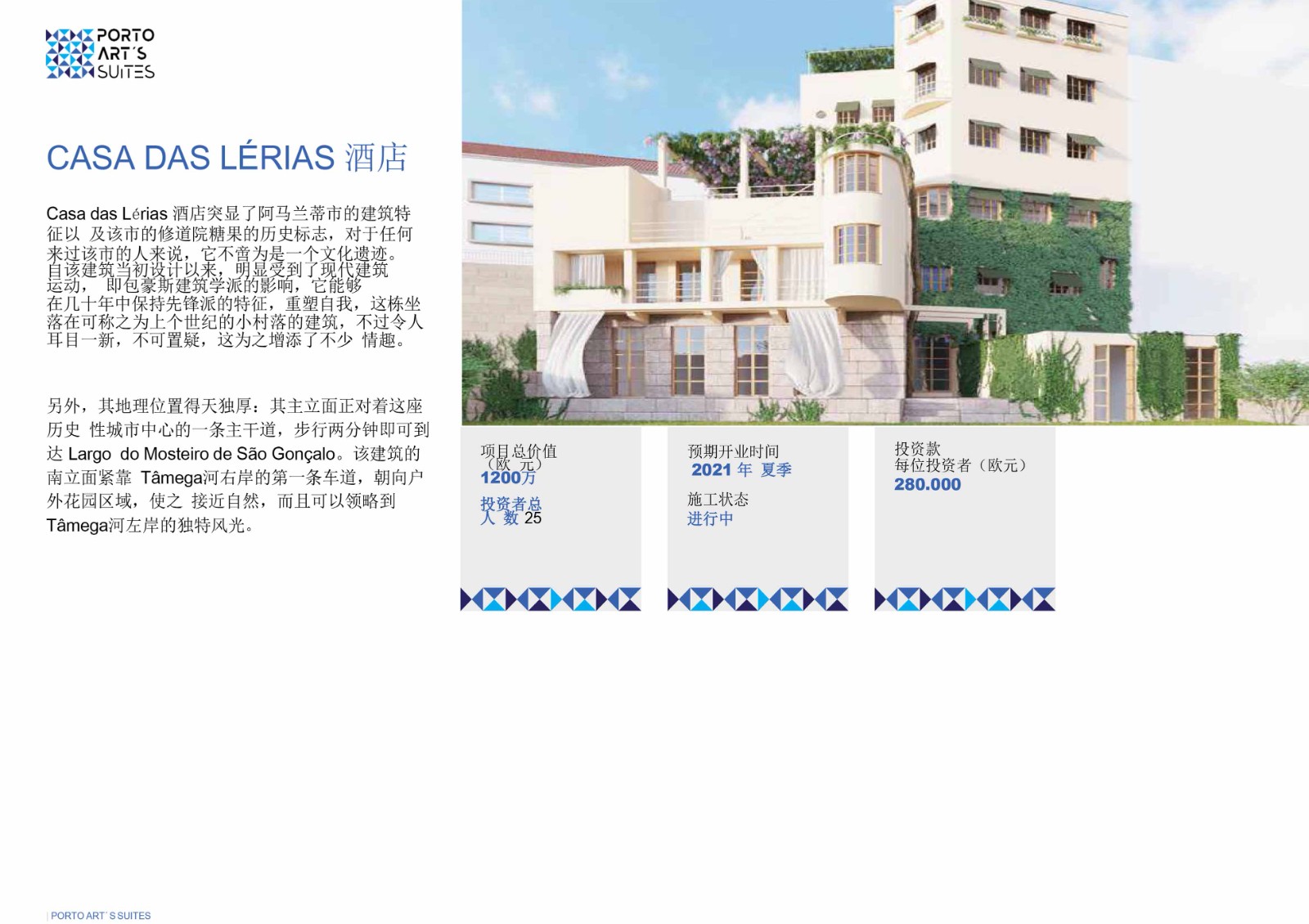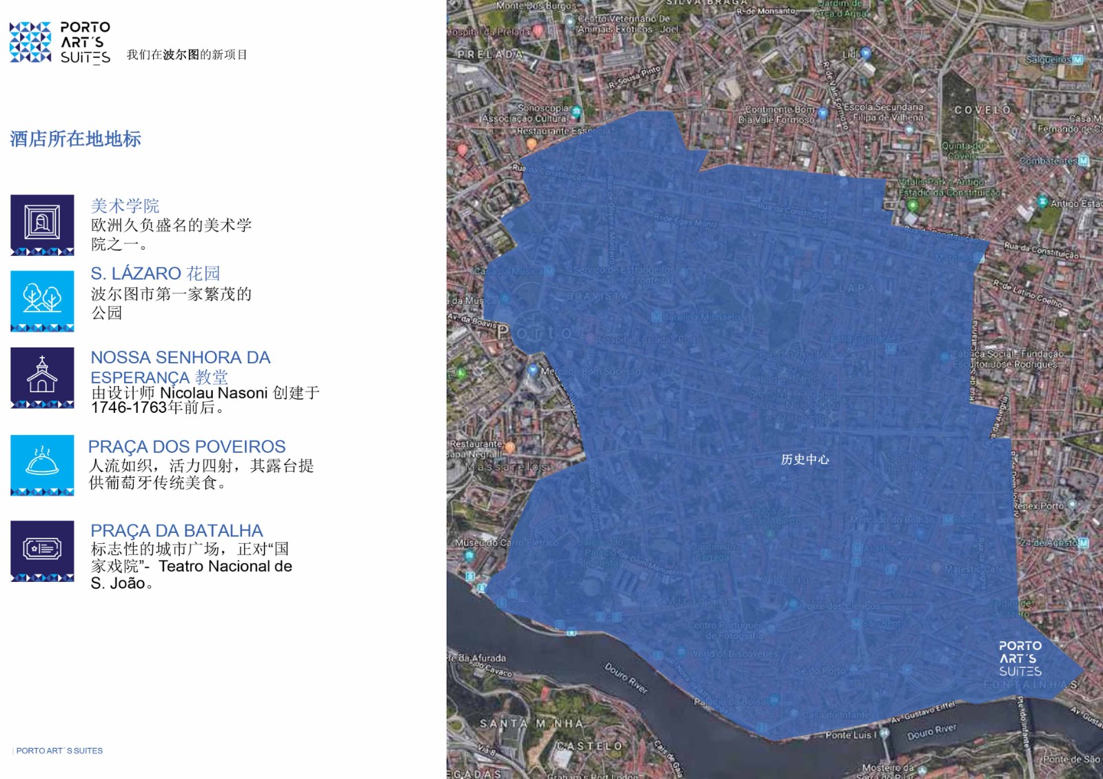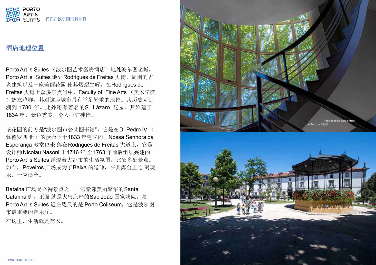 PortoArt´s Suites(波尔图艺术套房酒店)地处波尔图老城。PortoArt´s Suites 地处RodriguesdeFreitas大街,周围的古老建筑以及一座美丽花园使其熠熠生辉。在Rodrigues deFreitas 大道上众多景点当中,Faculty of FineArts(美术学院)鹤立鸡群,其对这座城市具有举足轻重的地位。其历史可追溯到1780年。此外还有著名的S.Lázaro花园,其始建于1834年,景色秀美,令人心旷神怡。
